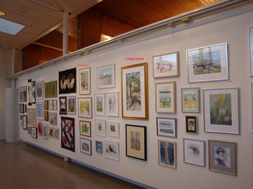 Cinas två utställda tavlor bland många andra på ena långväggen.